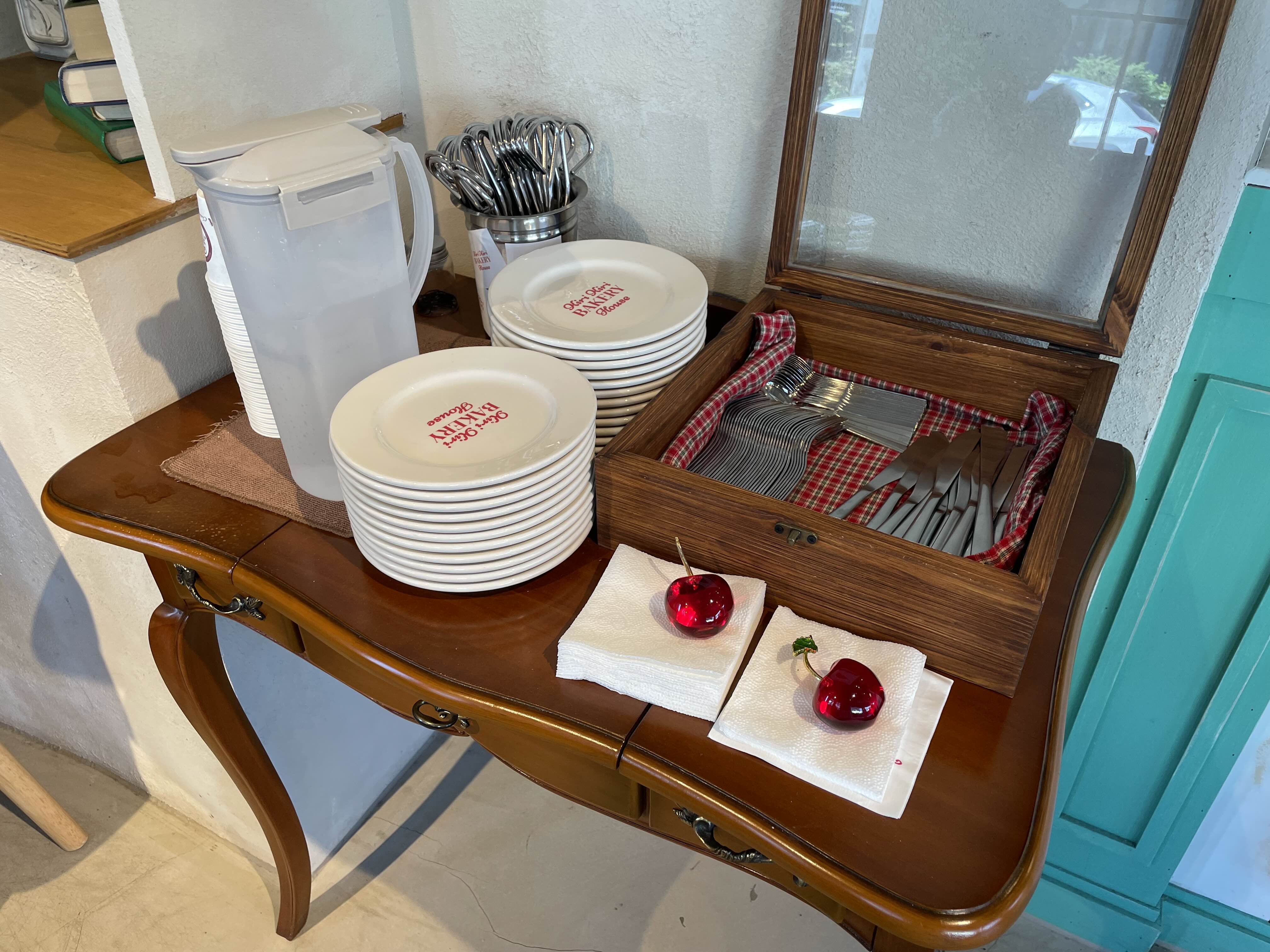식기, 티슈, 물을 구비해 놓은 곳이
